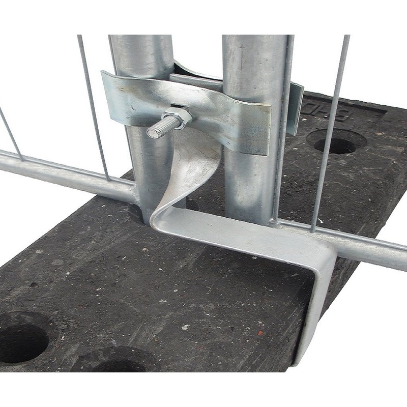 The construction fence lifting protection is a flat steel bracket, which is placed around the base. At the upper end of the safety element, the fields of the mobile fence are attached to the lifting protection with a connection clamp (see accessories).
