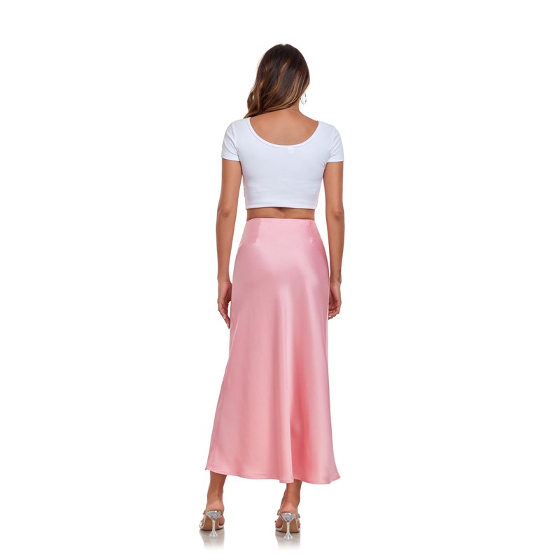 - Soft satin, skin-friendly, lightweight skirt with a smooth, polished finish. The waist and hips are snug and comfortable.