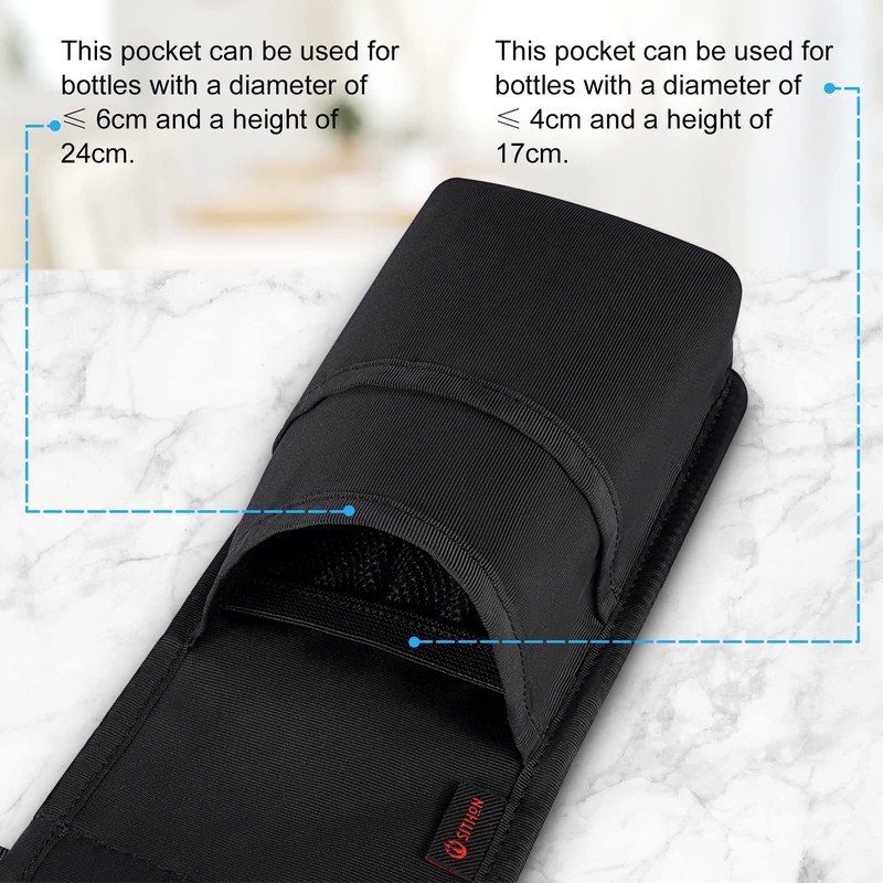- Bien organizado: el diseño frontal tiene 1 bolsillo grande y 1 bolsillo pequeño para guardar 1 botella de masaje de 8 onzas. Los pequeños bolsillos están forrados en los bolsillos grandes y pueden contener botellas de diferentes capacidades. Los bolsillos grandes pueden contener botellas de diámetro ≤ 2.36 pulgadas de alto, 9.65 pulgadas, los bolsillos pequeños pueden contener botellas con un diámetro de ≤ 1.55 pulgadas y una altura de 6.7 pulgadas.