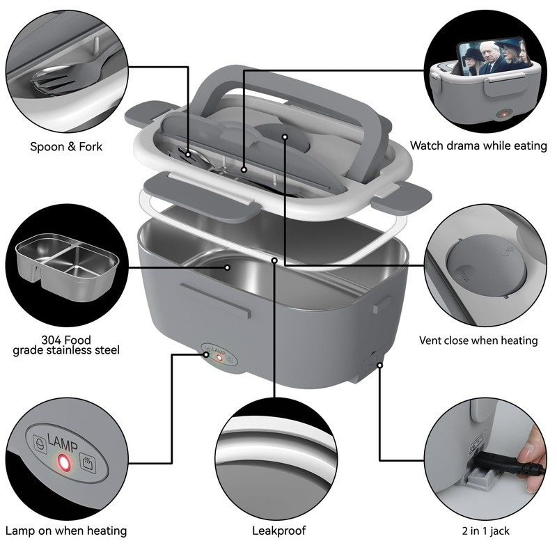 - [HEATING QUIET & ODORLESS] There is no sound when The electric lunch box is heating, no water vapor is released, and there are no peculiar smells. It can be heated half an hour in advance before leaving work without affecting others. You don't have to wait to use the microwave during busy off-hours. The lid of the lunch box is equipped with a sealing tape, which is very effective in preventing leaks. Food will not leak out even when the car is in motion.