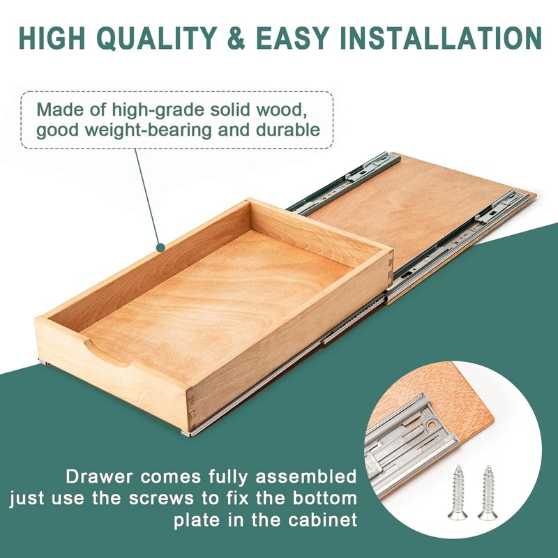 - EXCELLENT QUALITY: pull out drawers for kitchen cabinets are made of 0.59" in thick knotless SPLOD BEECH WOOD, 0.34" in thick Eco-board bottom, Drawer has no nails or screws, but dovetail joints keep our drawers strong and sturdy.