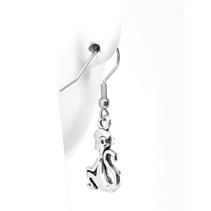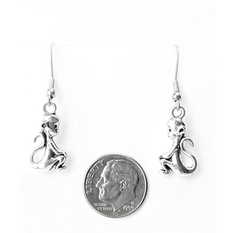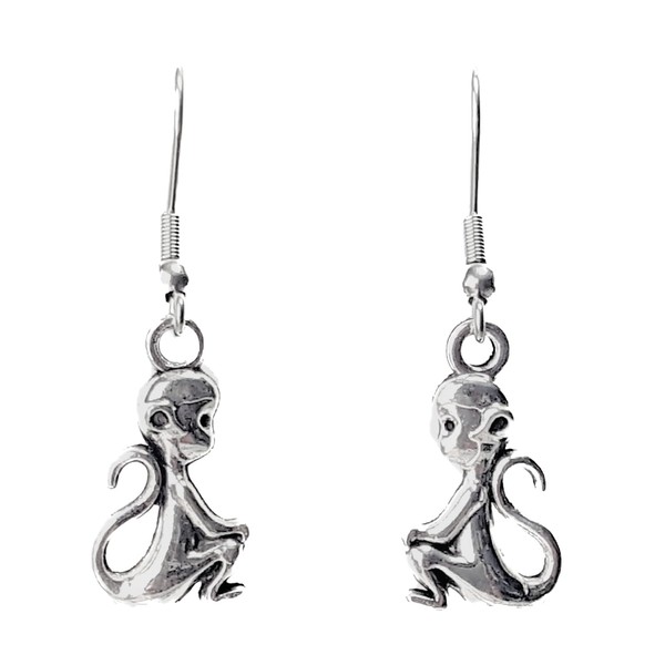 Sitting Monkey - 19x11mm - Silver alloy charm dangle earrings. Hypoallergenic Fishhook or Ball Post Earrings Option