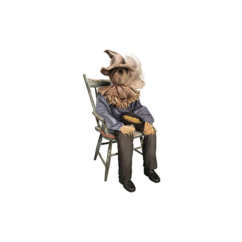 - Who dares to take candy from the scarecrow's bowl? If you do this scarecrow's head snaps up revealing a scary face. Dimensions: 16.54"x 14.67" x 53.54". Requires 4 AA batteries not included or one 6v2a adapter. Features a terrifying surprise, screaming and creepy laughter, motion and sound activated, footpad and external speaker compatible.