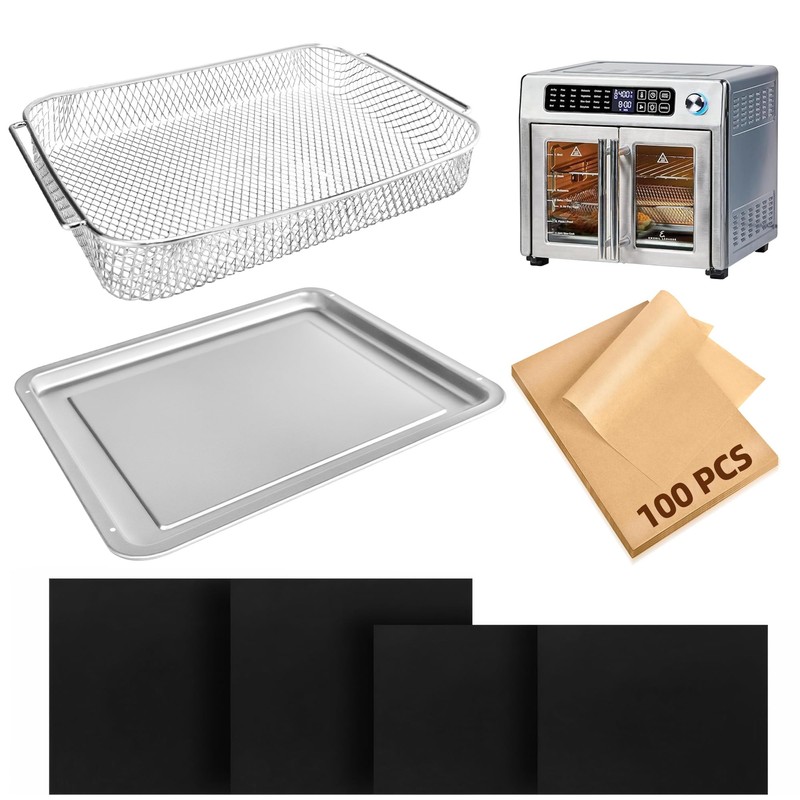 - Multi-Purpose: This oven pan set for Emeril Lagasse 26 Qt toaster oven is functional. Use the baking pan for cakes, while the air fryer basket is perfect for crispy fries. The parchment papers are ideal for lining pans, and the Teflon mats can be used for grilling or baking