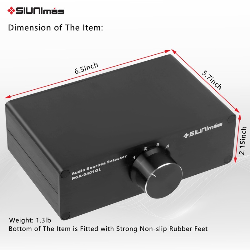 - SIUNIMAS Pure Copper RCA audio switcher box both working for 4-in 1-output and 1-in 4-out reversible, compatible with most of the RCA Audio playing devices.(Notes: 1-IN 4-OUT is not meaning 4 sets of output working simultaneously).