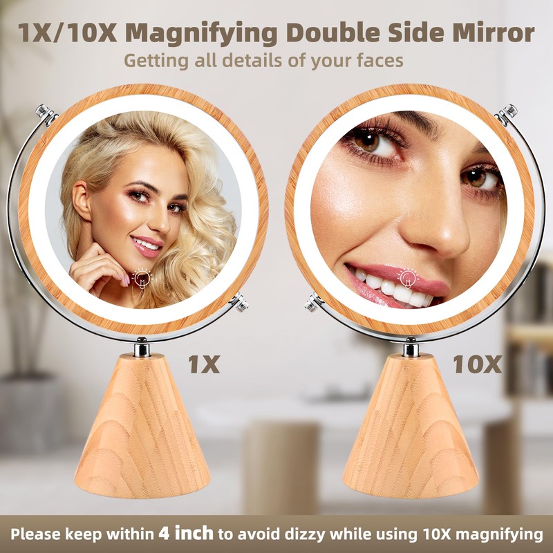 - 【LED Vanity Mirror and 100% Bamboo Base】A large 8’’ vanity mirror made of natural bamboo frame and base with metal stand. Natural bamboo is environmentally friendly. Easy to install, just screw on the base to finish the installation and use it directly. AS your make-up helper, it could provide you with a clear mirror, so that your whole face at a glance. Note: The actual size of the mirror is 6 inches.