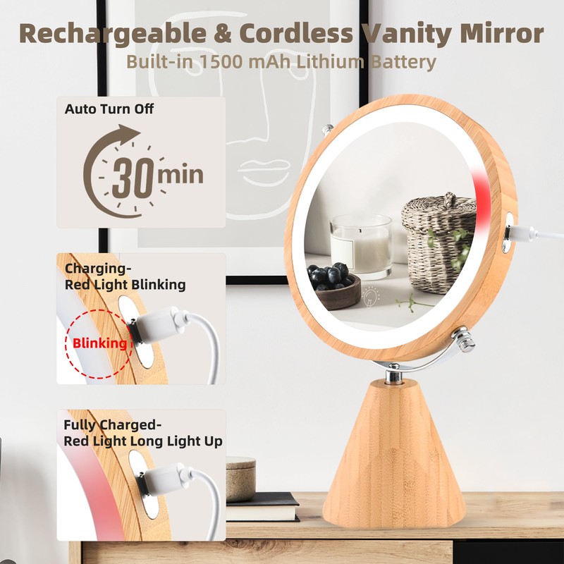 - 【WHAT'S INCLUDED】8 inch Bamboo Makeup Mirror with Lights*1, Type-C Charging Cable*1, Instruction Manual*1, Mirror Wipe Cloth*1.If you have any problems receiving or using this magnifying mirror with lights, please contact us through Amazon as soon as possible, we will reply you within 12 hours.