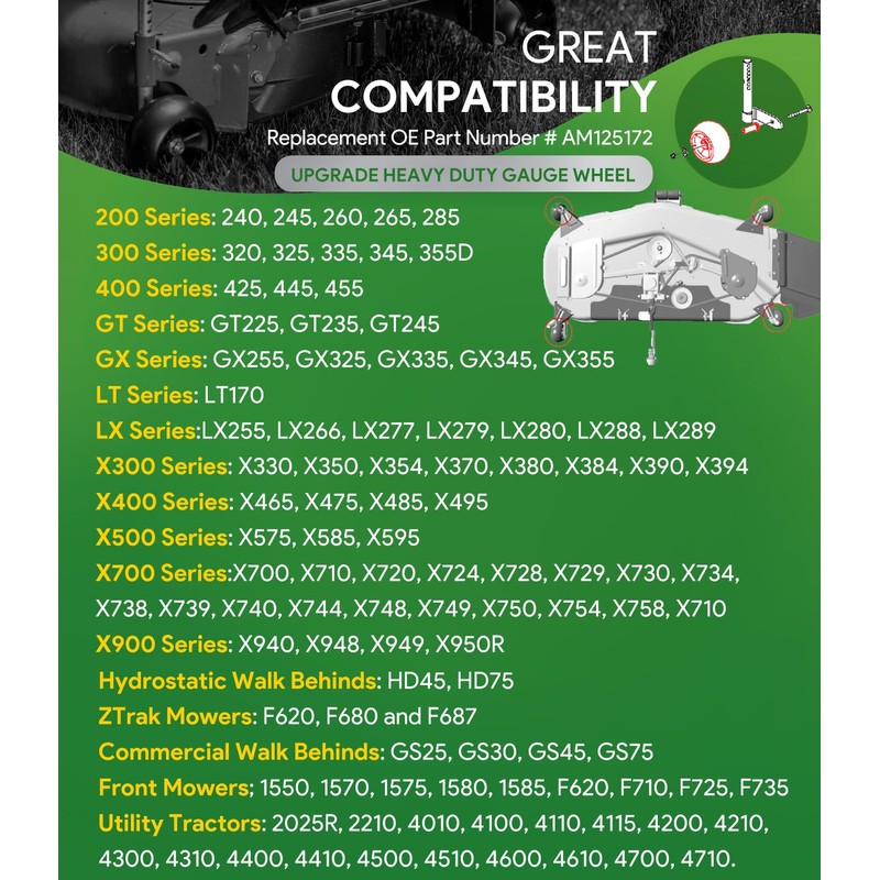 - Perfect Fit AM upgrade heavy duty gauge wheel kit is perfectly compatible with John Deere Tractor Mower Deck. For , , , GT, GX, LT, LX, X, X and X Series Lawn Tractor with ", ", ", ", " decks. Each part is professional manufactured and test to provide reliable OEM replacement part AM, AM, -.