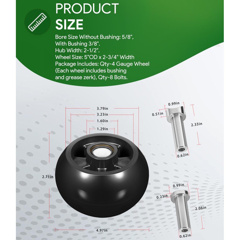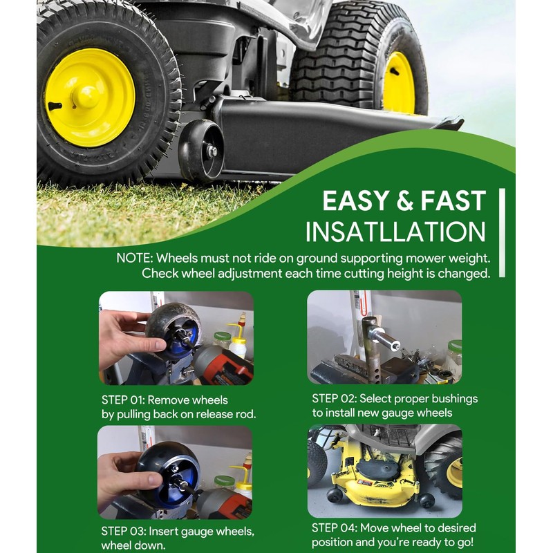 - Superior Material Tractor Mower Deck Wheel Kit are constructed of premium-grade hardened ABS plastic material. High strength, waterproof, corrosion and rust resistance, anti-skid, impact resistance for reliable and long-lasting durability. Bore Size Without Bushing: /", With Bushing /". Hub Width: -/". Wheel Size: "OD x -/" Width. Package Includes: Qty- Gauge Wheel (Each wheel includes bushing and grease zerk), Qty- Bolts.