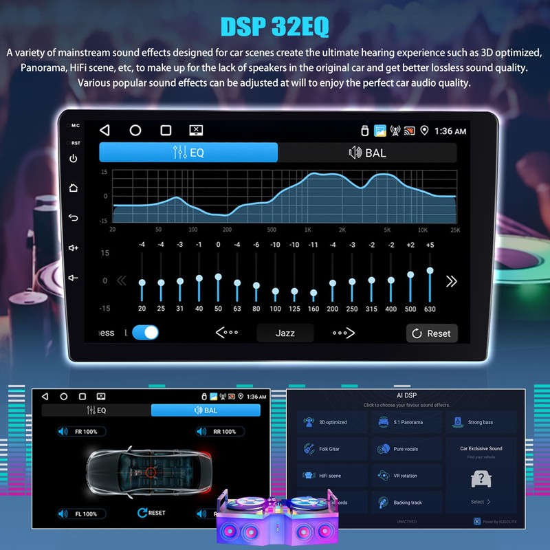 - 【AI DSP, 32EQ】A variety of mainstream sound effects designed for car scenes create the ultimate hearing experience such as 3D optimized, Panorama, HiFi scene, etc, to make up for the lack of speakers in the original car and get better lossless sound quality. Various popular sound effects can be adjusted at will to enjoy the perfect car audio quality.