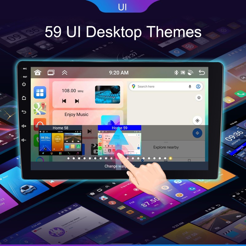 - 【59 Radio Themes, Split Screen Function】The upgraded radio can change 59 desktop themes. Different desktop themes can bring different visual experiences to your car. Long press the blank space of the homepage, you can change it to your favorite desktop theme at will. Support two kinds of applications to be displayed on the screen at the same time. Click the rectangle at the top of the screen, select a browse page and drag it to the left or right side of the screen.