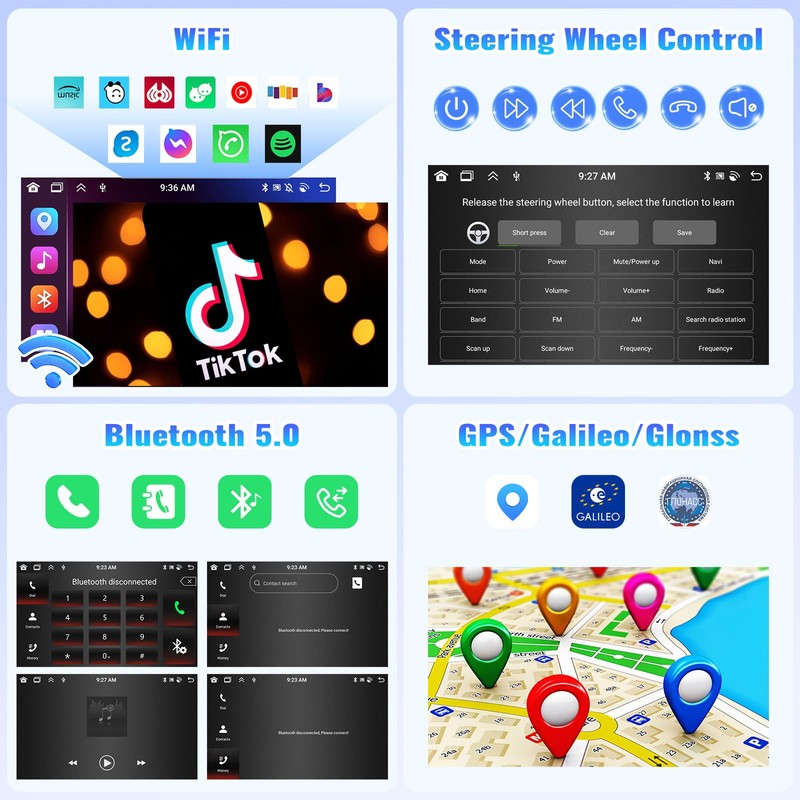 - 【WiFi, GPS/Galileo/Glonss】Connect to WiFi, you can download various applications on the upgrade radio. You can listen to online music and watch "YouTube" videos. It is as convenient as a large smart phone, adding fun to the journey. Support GPS/Galileo/Glons satellite positioning, you can download offline navigation directly from the Play Store. After connecting to WiFi, the online map can also be used perfectly.