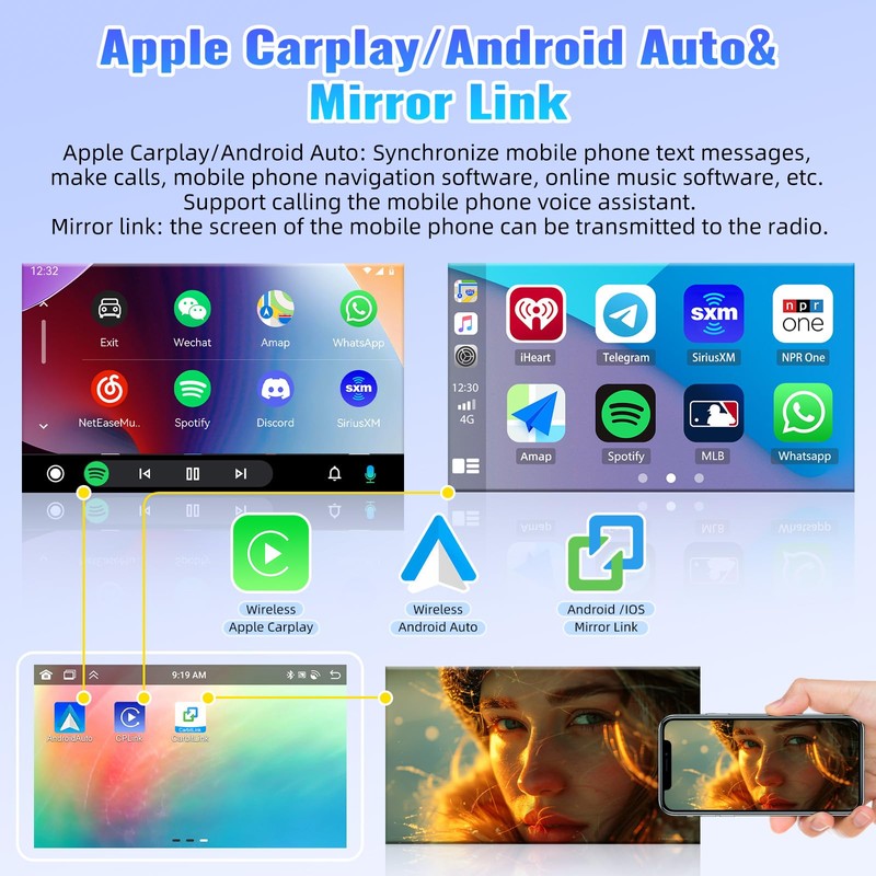 - 【Apple Carplay, Android Auto】The android radio can synchronize the phonebook, email, notification, map navigation APP, music APP on the phone to the radio, and support call mobile phone voice assistant for voice control. Keep the mobile phone WiFi switch on. Connect Bluetooth, Open the [CPLINK]/[Android Auto] APP to automatically connect. Or use a USB cable to connect the phone and then open the [CPLINK]/[Android Auto] APP.