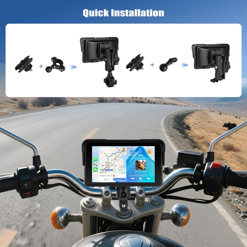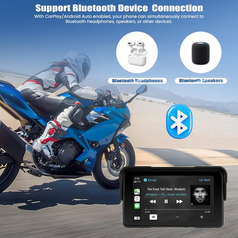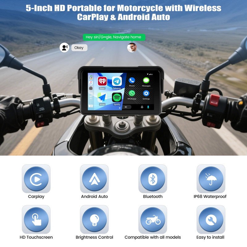 - Wireless Carplay & Android Car - Smart Assistants: Automatic connection via Bluetooth - no annoying manual pairing. Control navigation, calls and music via voice command. Full control without taking your hands off the handlebars.