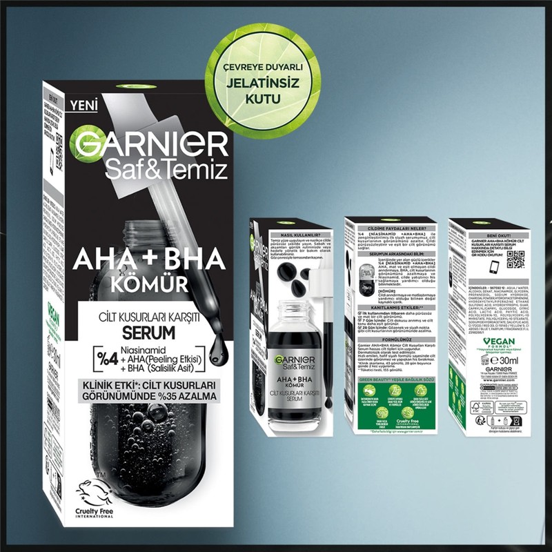 CİLDE FAYDALARI NELER? [%4 [NİASİNAMİD +AHA+BHA] ile zenginleştirilmiş ilk siyah serumumuz, cilt kusurlarının görünümünü azaltır. Cildi pürüzsüzleştirir ve eşit bir cilt görünümü sağlar. SERUMUN ARKASINDAKİ BİLİM: ·Kömür; cildi arındırmaya ve matlaştırmaya yardımcı olduğu bilinen doğal kaynaklı içeriktir. ·AHA, mat ve eşit olmayan cildi arındırmaya yardımcı olur. ·BHA, cilt kusurlarının görünümünü azaltmayı sağlar. ·Niasinamid, cilde yatıştırıcı his sağlamaya yardımcı olduğu bilinmektedir. NASIL KULLANILIR? Temiz yüze uygulayın ve nazikçe cilde pürüzsüz şekilde yayın. Sabah ve akşamları günlük rutininizde veya hedefe yönelik bir bakım olarak kullanabilirsiniz. Göz çevresiyle temasından kaçının. KANITLANMIŞ ETKİLER*: ·İlk kullanımdan itibaren daha pürüzsüz ve mat bir cilt görünümü. ·7 Gün İçinde: Cilt dokusu arınmış ve cilt tonu daha eşit görünür. ·28 Gün İçinde: Gözenek ve siyah nokta gibi cilt kusurlarının görünümünde azalma. *Tüketici Testi, 155 Gönüllü."Mesafeli Satış Sözleşmemiz uyarınca; toptan veya yeniden satış amaçlı oluşturulduğu tespit edilen siparişler ile ürün, hizmet ve indirimlerimizden tüm müşterilerimizin faydalanabilmesi ve stokçuluğun engellenmesi için 6 adetin üzerindeki doğrudan ve dolaylı siparişleri Eve’in iptal hakkı saklıdır."