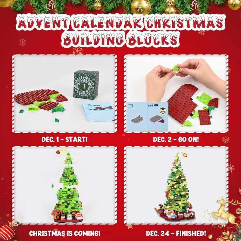 - 🌲【Advent Calendar Building Blocks】Our advent calendar unveils 24 unique little boxes, each box of building blocks comes with double-sided instructions that show how to build the Christmas, follow the detailed instructions toconstruct the tree step by step, and enjoy 24 wonderful days of holiday fun