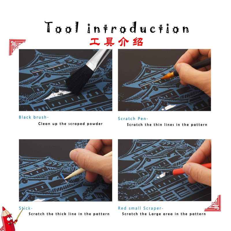 - Fonctionnement de l'outil pinceau - Utilisez un outil pinceau spécial pour supprimer les lignes grises du motif imprimé, afin que tout le monde puisse facilement faire le travail, et utilisez une petite brosse pour nettoyer la poudre noire grattée à temps.