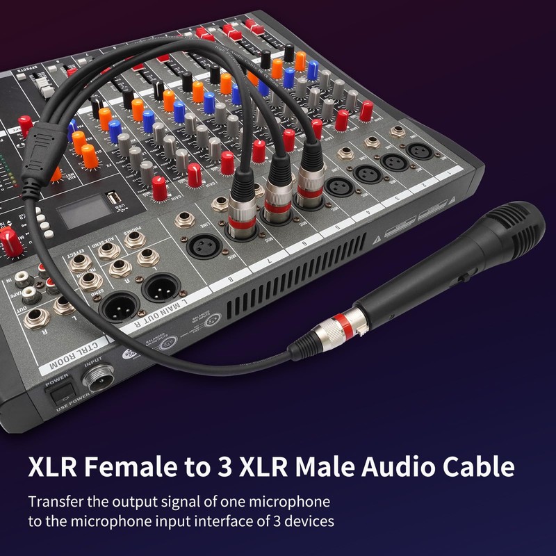 - 【XLR Splitter Cable 3 Way】This XLR 3 Way splitter cable distributes a single balanced microphone signal (1 female XLR input) to three separate outputs (3 male XLR connectors), perfect for sending one audio source to multiple devices like mixers, recorders, or PA systems simultaneously, is perfect for distributing audio signals to multiple destinations without signal loss