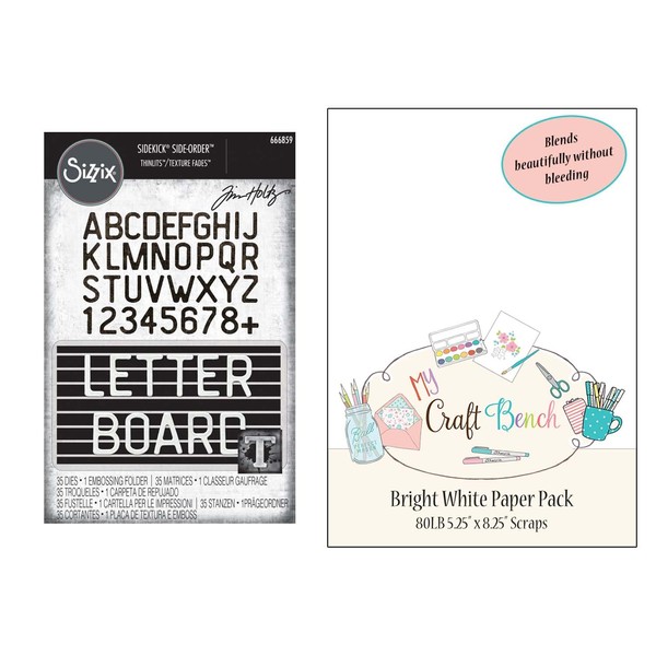 Product is a bundle of 2 items. Sizzix Sizzix 2D Embossing Folder & Thinlits Set Vault Side Order Letterboard by Tim Holt bundled with MCB 80LB Paper Pack. 2D embossing folders add intricate texture that enhances your work with professional-quality detail. Complementing the embossing folder is a Thinlits Die Set. My Craft Bench Paper Pack features three sheets of bright white scrap cardstock measuring approximately 5.25 inch x 8.25inch. Paper stamps beautifully without bleeding and is perfect for creating you die-cut shapes.