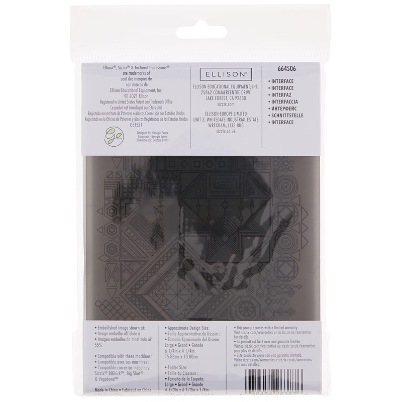 • Interface – This 3D textured impressions embossing folder interface contains so many detailed elements that are perfect for use in paper craft and card making projects Combine this embossing folder with the Sizzix Luster Wax (664809, 664810, 664811) to add an extra sparkle to your craft!