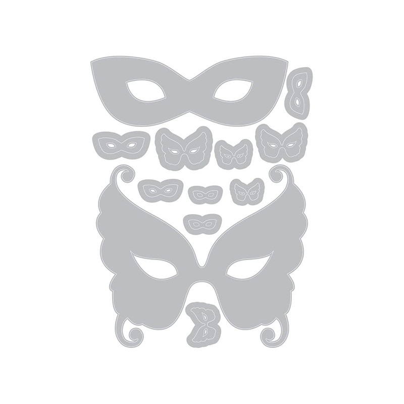 • Add a magical element to your projects! The Thinlits masquerade set by Tim Holtz contains two types of masks in six sizes each. Use the large masks as a focus on cards and party invitations and add accents to collages and other projects with the small masks. They are just the right size to work with Tim's collage figures from Idea-ology paper dolls!