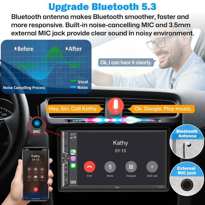 - Upgraded Bluetooth Smart Chip: Adopts independent Bluetooth module and Bluetooth antenna for more efficient transmission, reduced static noise, hands-free calling and wireless audio streaming. Powerful upgraded smart chip for faster connection and lower signal delay. Built-in ultra-clear microphone for clearer calls and more accurate voice control that won't distract your driving attention and ensure safer driving