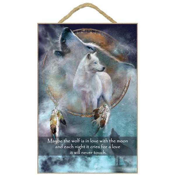 - Wolf dream catcher sign reads "Maybe the wolf is in love with the moon and each night it cries for a love it will never touch"