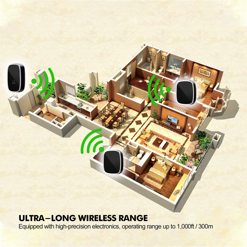 - 🎁【ULTRA-LONG WIRELESS RANGE】Equipped with high-precision electronics, operating range up to 1,000ft / 300m, three receivers suitable for two or more storey homes. Receivers can be placed on each floor and buttons can be installed at the front and back doors.