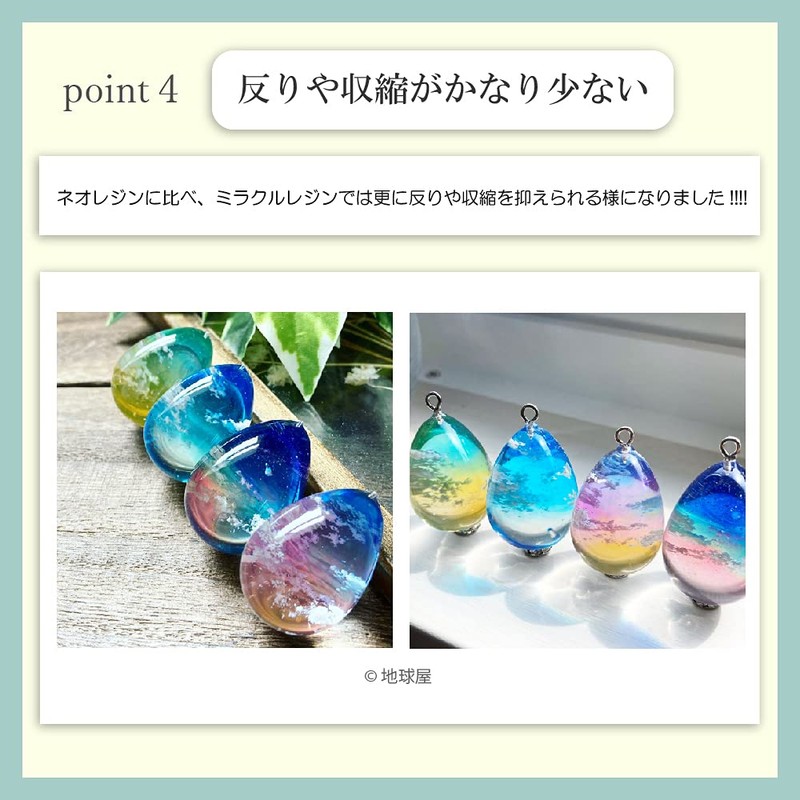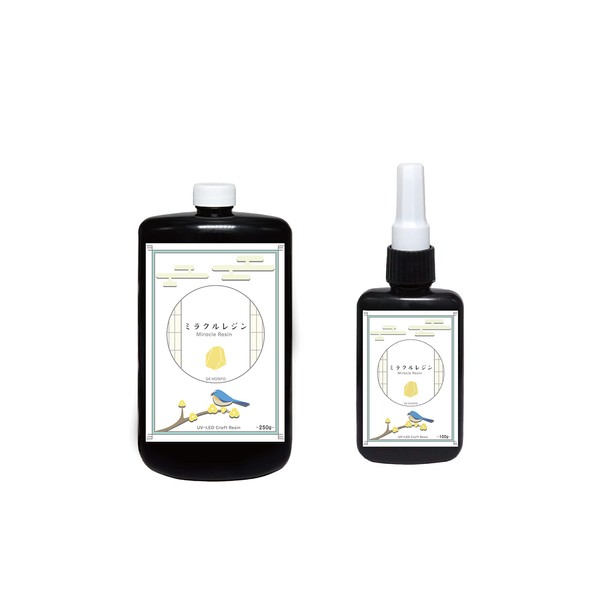 [Features] 1 liquid resin that hardens with UV-LED lights or UV lights. Very transparency. It will not change over time and remain crystal clear. Very resistant to yellowing. It has a characteristic that returns to transparent color over time even if the UV light is exposed to a yellow tint during initial curing. (It returns faster than neoresin. The UV-LED light begins to cure in 1-2 seconds, and cure in 60-120 seconds. It has less odor than conventional products. The smooth viscosity is perfect for fine molds. Can also be used as a surface coating agent. ◎ Even silicone molds with low shrinkage rate. It will not stick easily after fully cured, giving it a beautiful finish. Curing Time Estimate: UV-LED lights: Approximately 1 minute to 2 minutes; Curing Wavelength: 365 - 405 nm (nanometer) *Varies depending on the thickness of the piece and season. This is an estimate when illuminated with a light at 24 - 48 W. If you use a garment agent, please irradiate it in a longer period than the above. Storage conditions and shelf life estimate: Temperature: 32.0 - 59.1 °F (0 - 25 °C); Places away from direct sunlight; Approximately 12 months (must be tightened tightly to prevent moisture absorption and avoid direct sunlight); Caution: Do not touch with bare hands when liquid (unhardened). It may cause allergies.