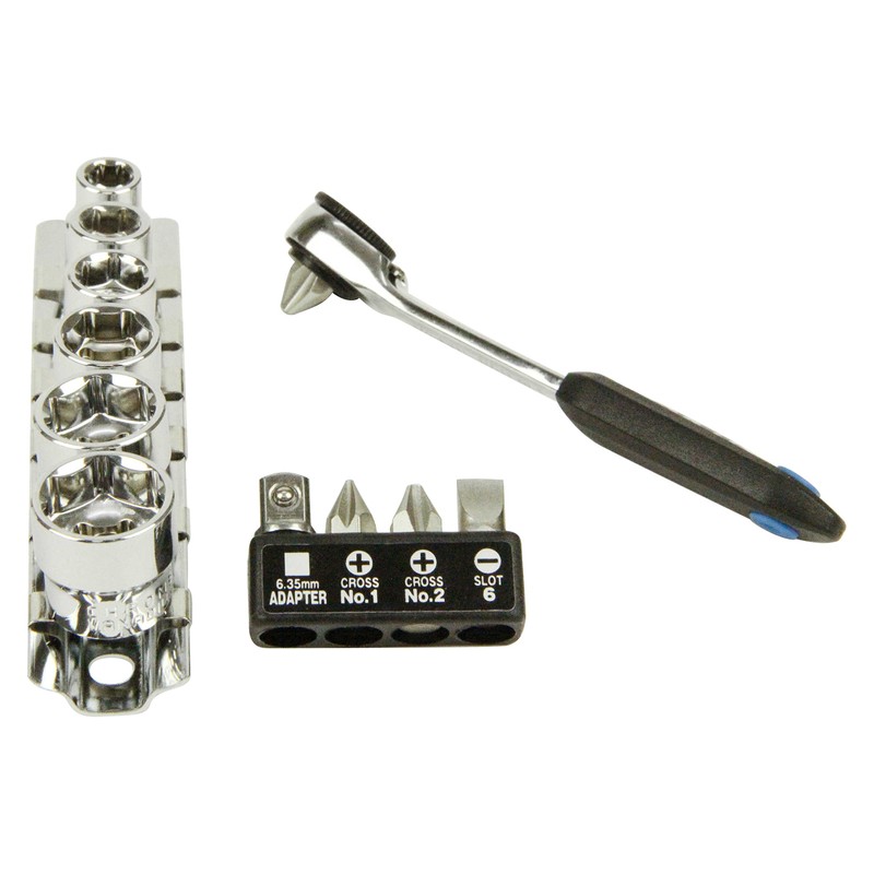 • Set Includes: Slim ratchet screwdriver, 0.6 inch (16 mm) single-head bit + No.2, 19 mm bits + No.1, + No.2, -6 mm, 6.35 sq. Sockets 5.5 mm, 7 mm, 8 mm, 10 mm, 12 mm, 13 mm, 6.35 sq. Adapter bits for sockets