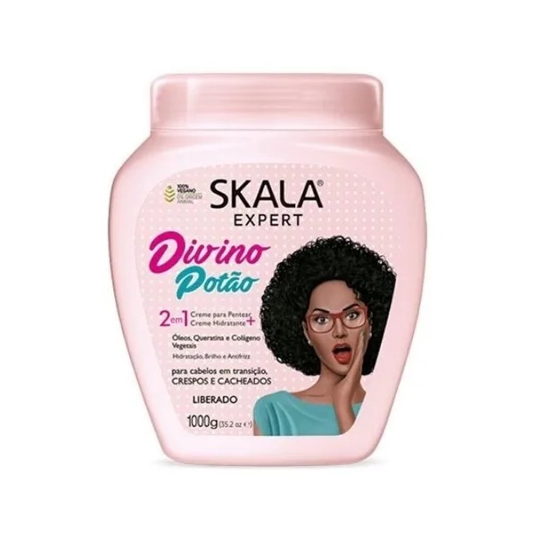Skala Divino Potão es una crema capilar multifuncional diseñada especialmente para cabello rizado, ondulado o afro. Su fórmula 100% vegana está enriquecida con aceite de ricino, colágeno vegetal, arginina y queratina vegetal, ingredientes que fortalecen, nutren y ayudan a definir los rizos, al mismo tiempo que reducen el frizz. Puede ser utilizada como crema para peinar sin enjuague o como tratamiento hidratante. Es apta para el método Curly Girl, ya que no contiene sulfatos, parabenos, siliconas ni sal. Su presentación de 1000g ofrece un excelente rendimiento y cuidado intensivo.