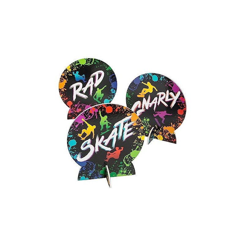 - Each set includes three paint spattered skateboard party centerpieces that will make tables at a skate-themed party look stellar! Assorted. Material: Foam. (3 pcs./set) Size: 3" x 9 1/4" Simple assembly required.
