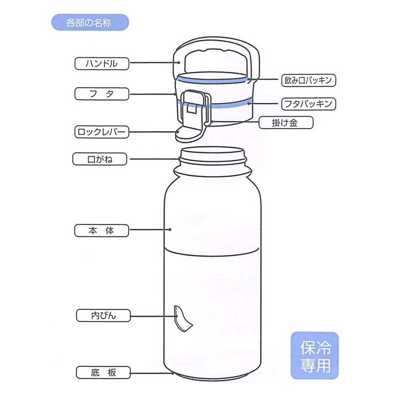 - Materials: Inner bottle/spout: Stainless steel; Body: Stainless steel (acrylic resin coating); Lid: ABS resin; Gasket: Silicone rubber; Bottom Plate: Elastomer resin
