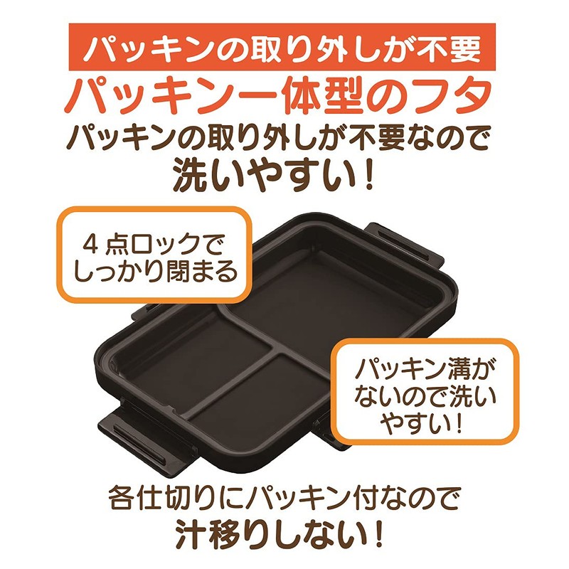 - Easy to clean lunch box with integrated lid. Antibacterial with silver ions No need to remove the washer and easy to wash. 4-point lock securely closes to prevent leakage. Each compartment comes with a gasket, so it won't transfer juice. The dome lid makes it easy to serve dishes, etc. The integrated divider container allows you to neatly separate your ingredients and pack them easily