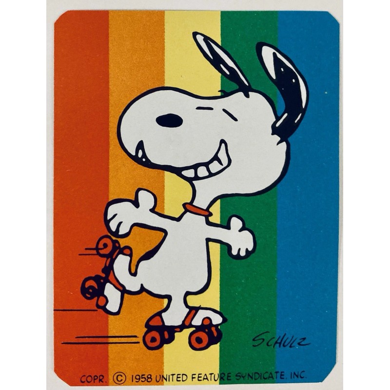 Vintage Skating Snoopy with rainbow stripes magnet, 2 3/4”x 2 1/4”