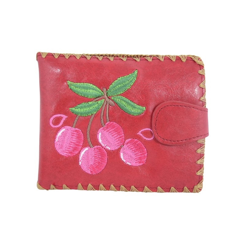 Skelapparel Cute Cherry Embroidered Vegan Leather Bi-Fold Wallet for Women – Adorable and Functional Design (Red, Medium)