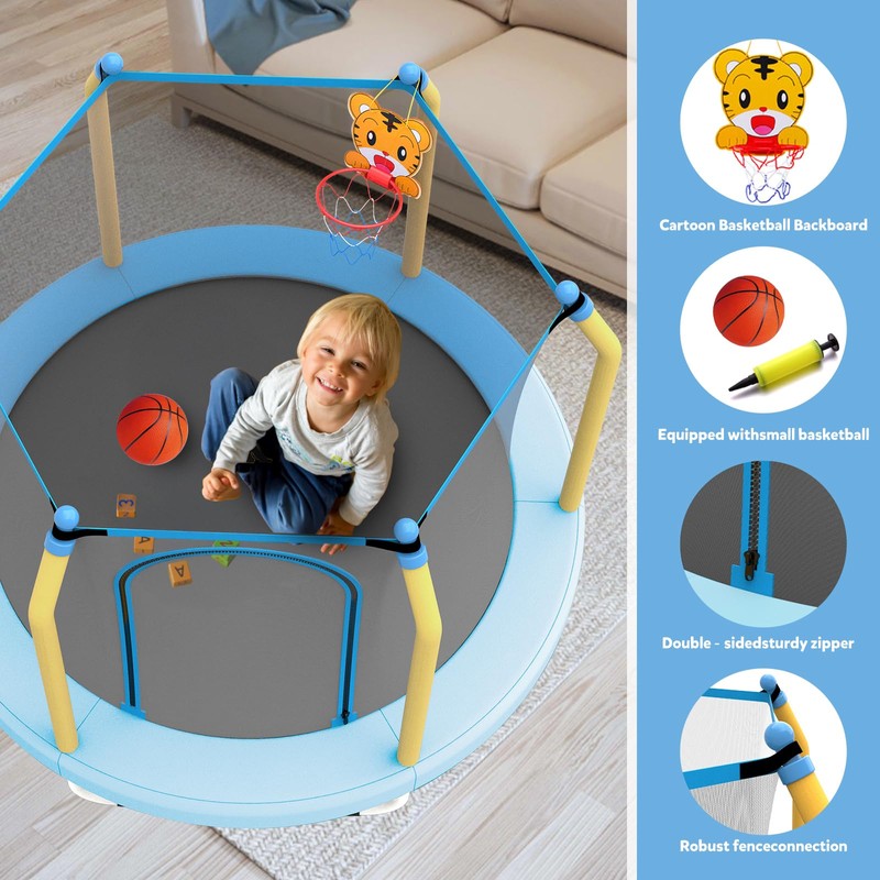 Skepphlay 55" Trampoline for Kids, Mini Trampoline Indoor with Basketball Hoop, No-Gap Safe Design, Kid Trampoline Indoor with Safety Enclosure Net for Boys Girls, Ages 1-8 (Blue)