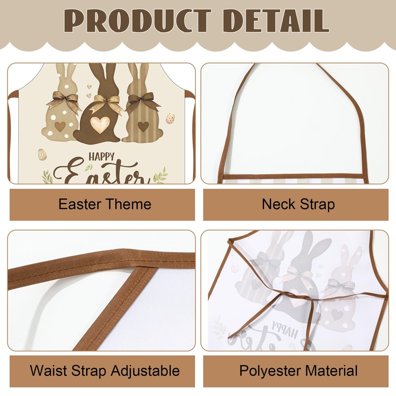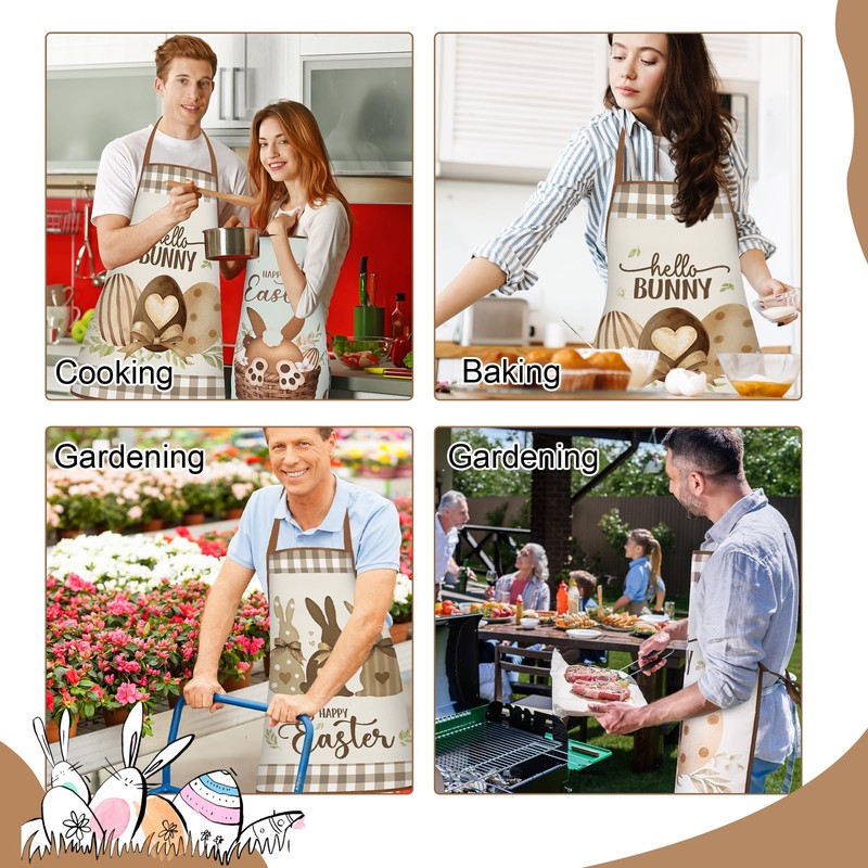 - Easter Themed Aprons: our Easter aprons are colored in brown and green, designed with buffalo plaid, Easter bunny, rabbit ear, egg, flower, and the word of "hello BUNNY", "HAPPY Easter", which will bring joy to your home