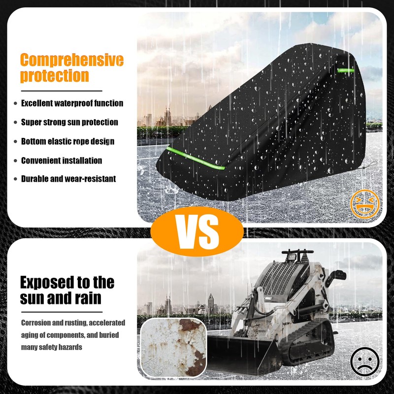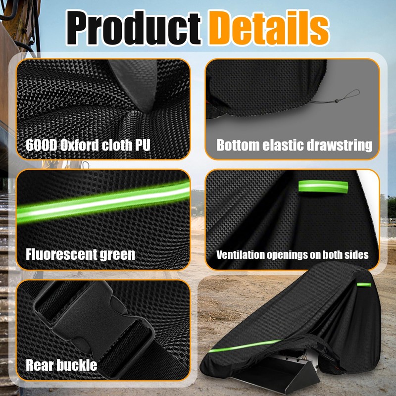 • HUMANIZED DESIGN: The skid steer cover bottom elastic drawstring design allows for free adjustment of elasticity and a tight fit to prevent rainwater infiltration. The bottom buckle design enables quick fixation and disassembly, while the fluorescent green color allows you to easily install the skid steer loader even at night. The ventilation design can keep the machine dry and very convenient to use.