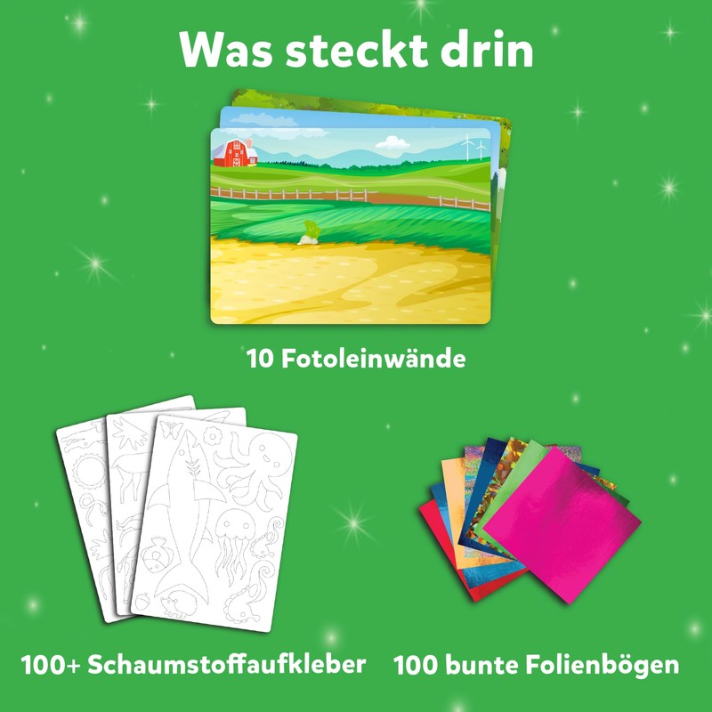 - What is included: 100 coloured foil sheets, 10 foam sticker sheets (100+ foam stickers), 10 photo canvas, wiggly eyes, instructions for use