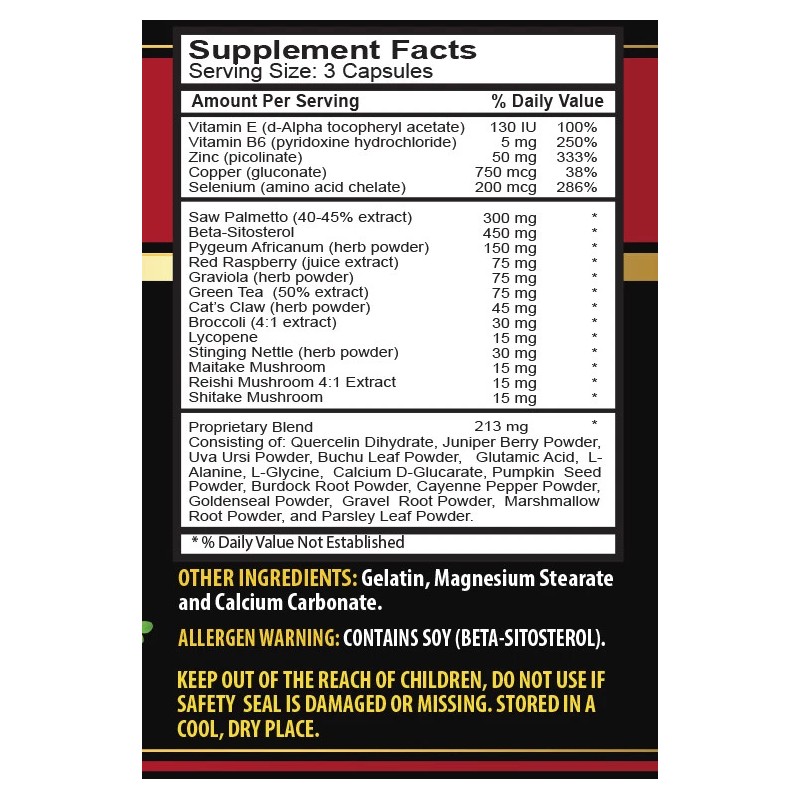 - Active Ingredients: Broccoli, Green Tea, Red Raspberry, Saw Palmetto, Soursop (Graviola), Stinging Nettle (Urtica dioica), Graviola, Cat’s Claw