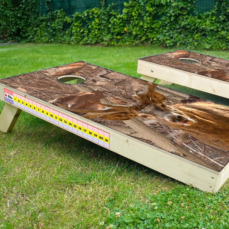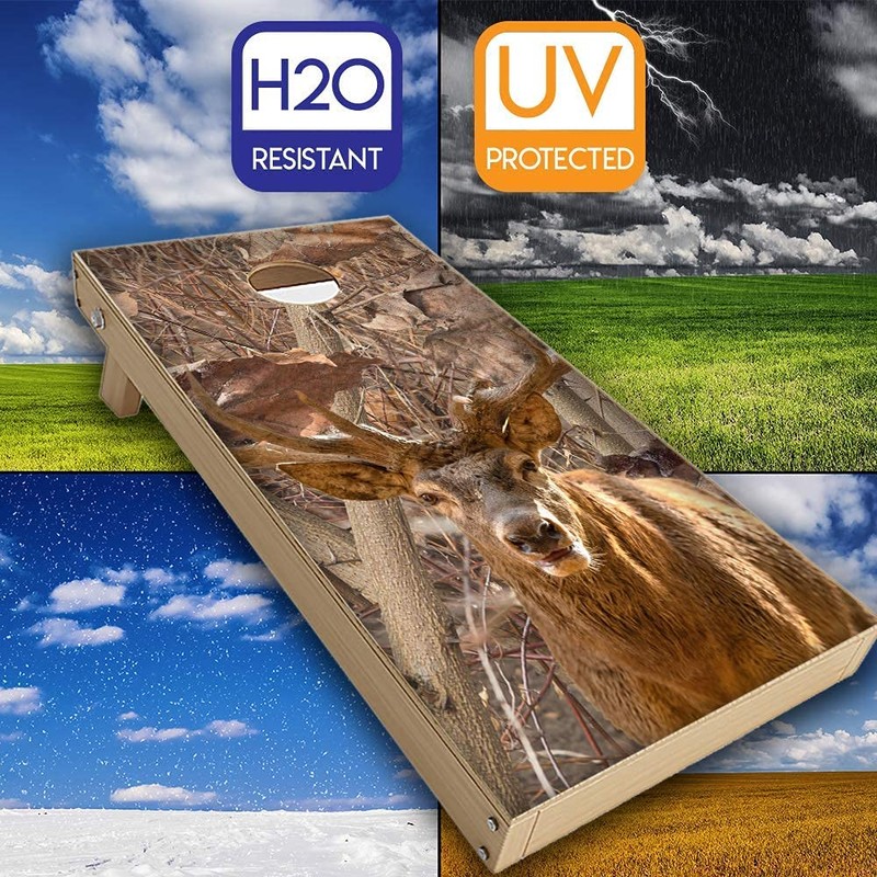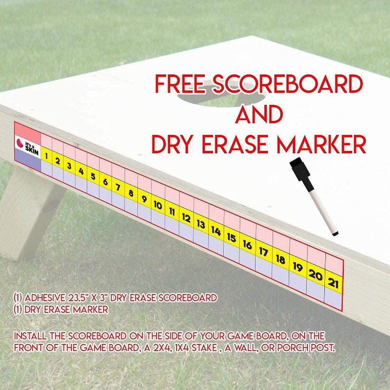 - LET'S GET STARTED: Included are a Skin Kit for your Cornhole game board, includes (2) regulation size 24x48" vinyl wraps/sheet/decal without hole cut, (1) adhesive 23.5" x 3" dry erase scoreboard, and (1) dry erase marker. Cornhole game / board not included. Install the scoreboard on the side of your game board, on the front of the game board, a 2x4, 1x4, a wall, or porch post.