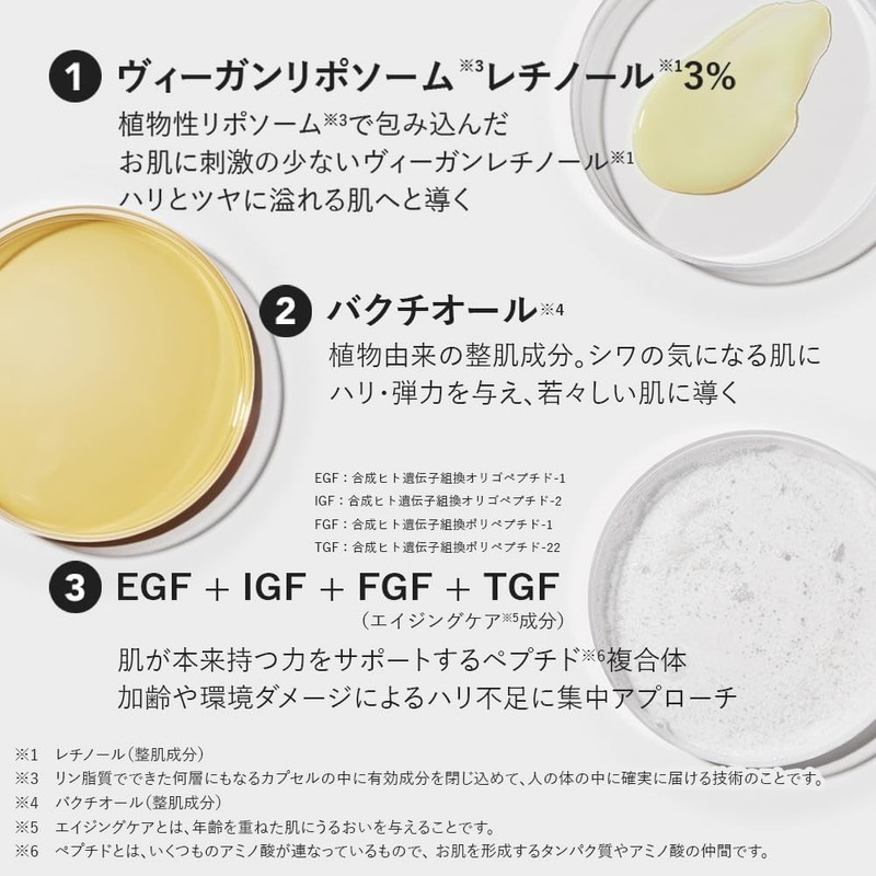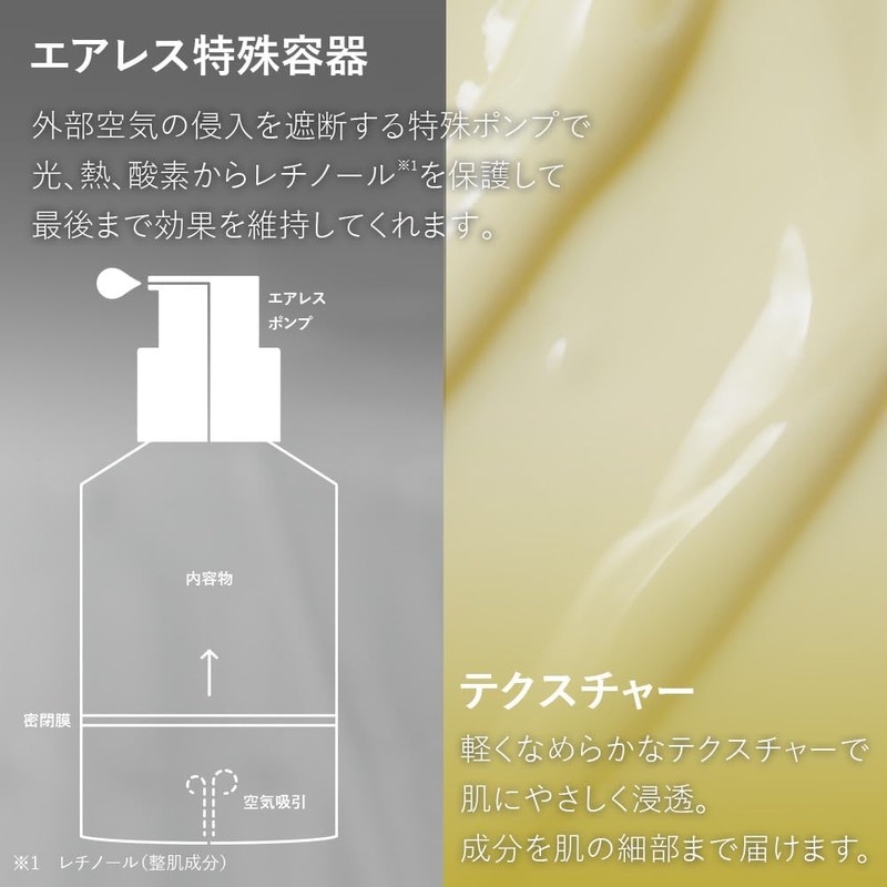 - This highly concentrated retinol serum contains 3% "vegan liposomal retinol." It leaves skin firm and radiant. Retinol is encapsulated in plant-derived ingredients for a low-irritation experience. Nanoliposomal retinol, 238 times smaller than pores, is absorbed into pores for optimal results. The special airless container prevents air from entering. This protects the retinol from light, heat, and oxygen, ensuring its effectiveness until the very end.