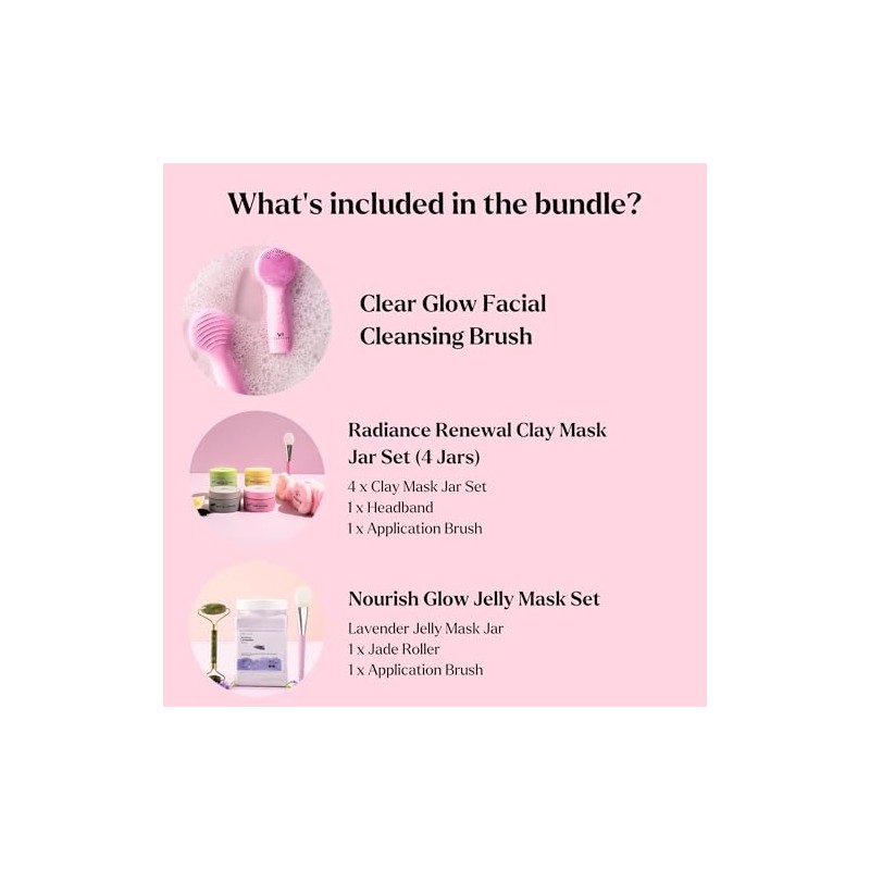 - Radiant Glowing Skin With The Ultimate Skincare Bundle: Achieve deep cleansing, detoxification, and nourishment with this 3-in-1 skincare bundle including a sonic facial cleansing brush, clay mask set and jelly mask jar. Perfect for glowing, rejuvenated skin from the comfort of your home.