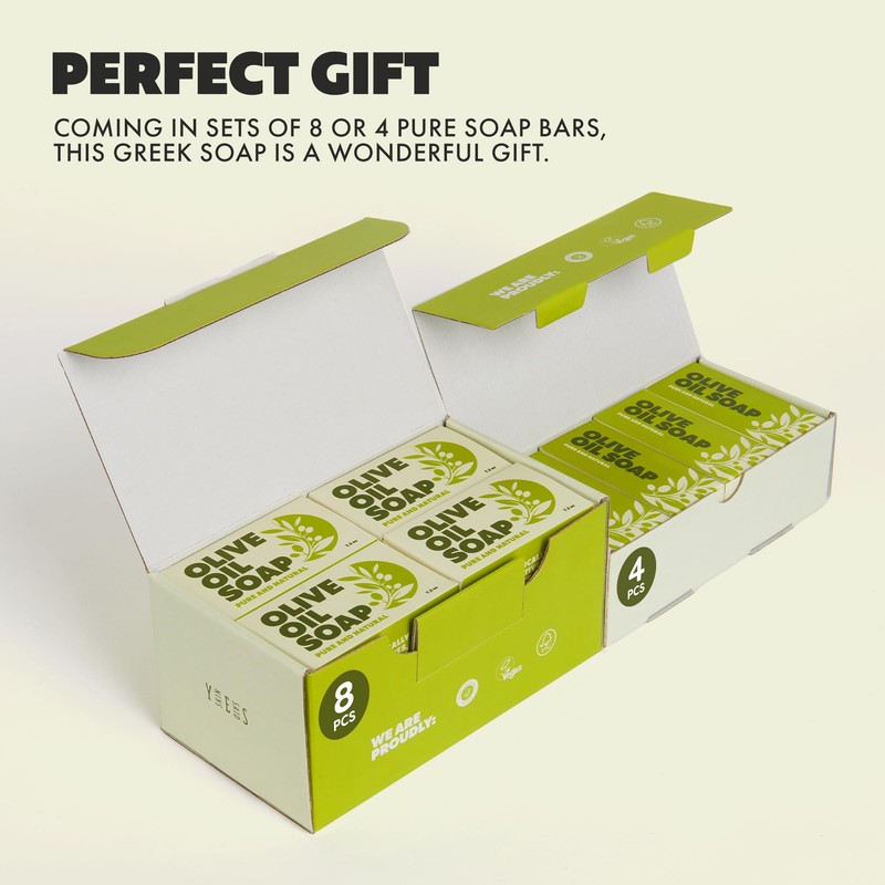 - PERFECT GIFT - Coming in sets of 4 or 8 pure soap bars, this Greek soap is a wonderful gift. Olive oil is loaded with antioxidants, such as vitamins A & E, which protect the skin & make it a valuable gift for anyone!