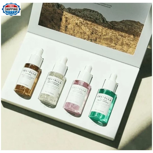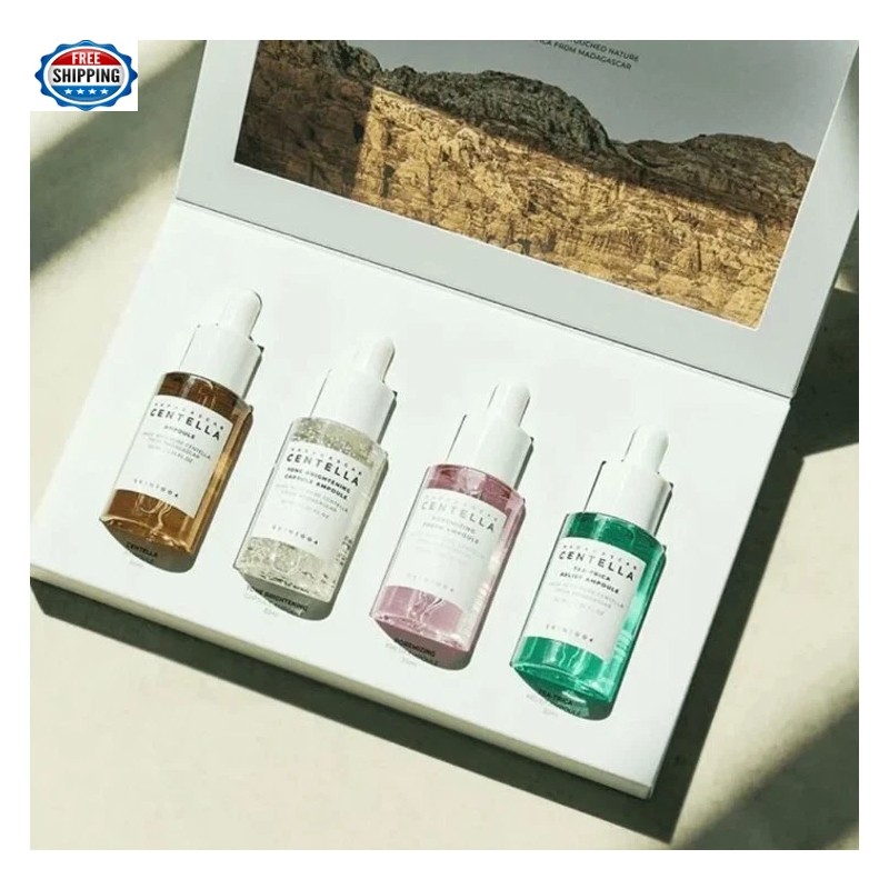 Pamper your skin with this Madagascar Centella Ampoule Kit containing four mini-sized ampoules targeting different skin concerns. The Centella Ampoule soothes and repairs damaged skin. The Tone Brightening Capsule Ampoule evens skin tone for a radiant finish. The Poremizing Fresh Ampoule minimizes enlarged pore. The Tea-Trica Relief Ampoule calms irritation and treats acne. Take a few drops of the ampoule and gently apply on face.