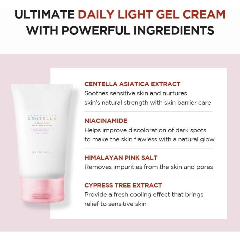 Continúa con la Light Gel Cream, una crema en gel ligera que ofrece una hidratación profunda, sin sensación pegajosa. Formulada con extracto de Centella Asiática de Madagascar y enriquecida con sales rosas minerales de las majestuosas montañas del Himalaya, esta crema calma y revitaliza la piel, minimizando los poros y proporcionando un acabado húmedo y radiante. Perfecta para pieles mixtas a grasas, esta fórmula se absorbe rápidamente, dejándote con una sensación de frescura y suavidad todo el día. 💧