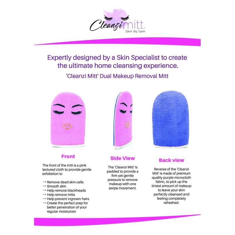 The Cleanzi Mitt, has two sides that work together to revitalize and rejuvenate your skin. A soft purple microfibre side that's perfect for removing makeup along with a pink exfoliation side that helps exfoliate your face and neck while helping remove blackheads and whiteheads and rejuvenating your skin.