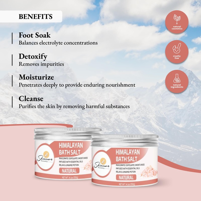 - The Purest Himalayan Bath Salts: Himalayan bath salts are a type of bath salt that is derived from the Himalayan region, particularly from the salt mines in the Punjab region of Pakistan. These salts are known for their distinctive pink colour, which is attributed to the presence of trace minerals such as iron, magnesium, potassium, and calcium.