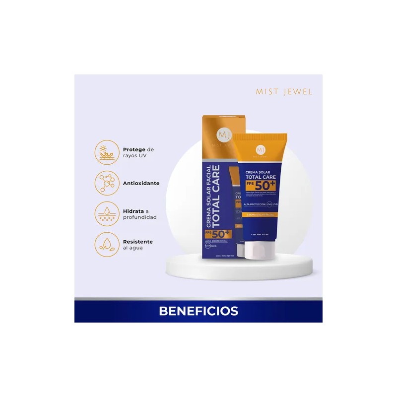 ¡Protege tu piel del sol mientras la mantienes hidratada con Mist Jewel Total Care FPS 50+! 🛡️ Este protector solar facial de amplio espectro ofrece una protección total contra los rayos UVA y UVB, previniendo quemaduras y el envejecimiento prematuro. Enriquecido con ácido hialurónico, hidrata profundamente tu piel, dejándola suave y flexible. Su fórmula resistente al agua y dermatológicamente probada es ideal para todo tipo de piel, ¡incluso las más sensibles! 💧